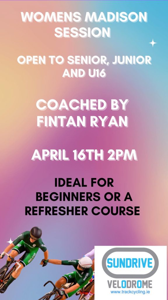 Women’s Madison Training Published April 4, 2023 suitable for all levels and open to Senior, Junior; U16 https://eventmaster.ie/event/DdGxFmAcJr Published in Uncategorized Previous Post Junior Track Camp (Wed 12th- Fri 14th April) Next Post Orangefield Track